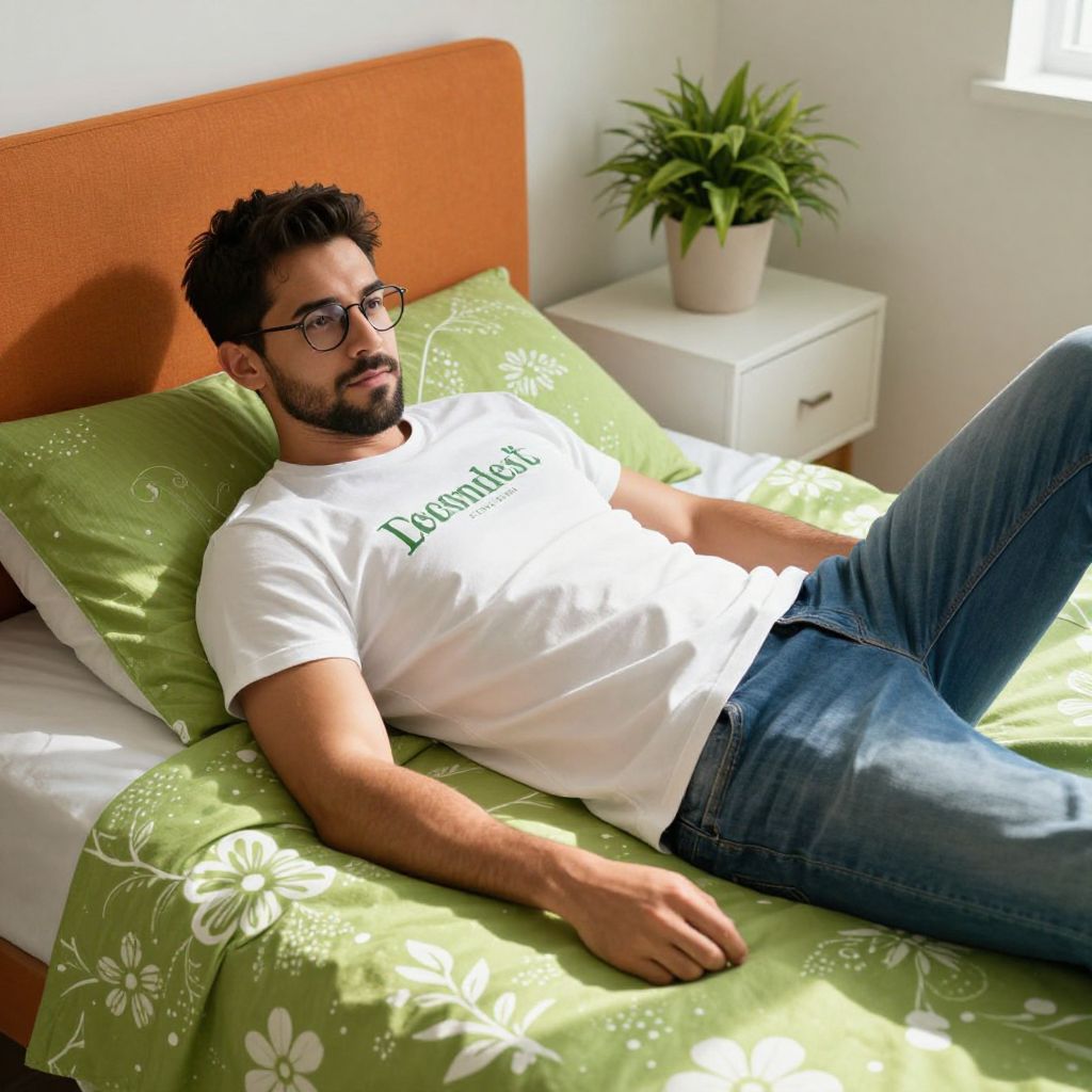 A CGI image of a handsome, dark-haired man with a beard and glasses, lying on a green bed with white floral patterns. He's wearing a white t-shirt with green text and blue jeans. The room has orange headboard, white nightstands, and a potted plant. Sunlight streams in from a window, casting a bright, natural light. He looks relaxed and casual.