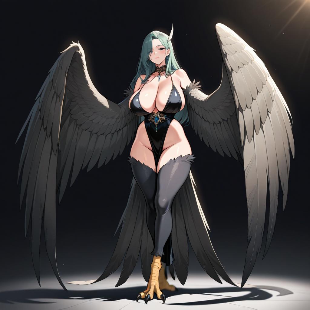 1girl, harpy, feathers, full body, talons, mature girl, big wings, Original Character, Volumetric Lighting, Best Shadows, Shallow Depth of Field, Stunningly Beautiful Girl, Petite, Delicate Beautiful Attractive Face