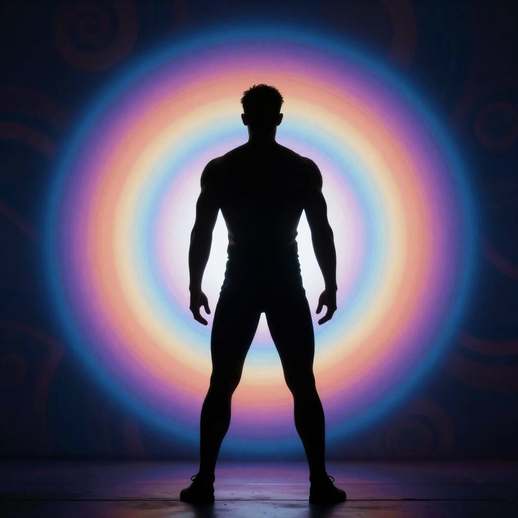 Silhouetted muscular man with bald head stands facing large table engulfed in bright flames in dimly lit, industrial room. Bar stools and scattered objects in background. Dark shadows, intense firelight, two dark shapes on floor to right.