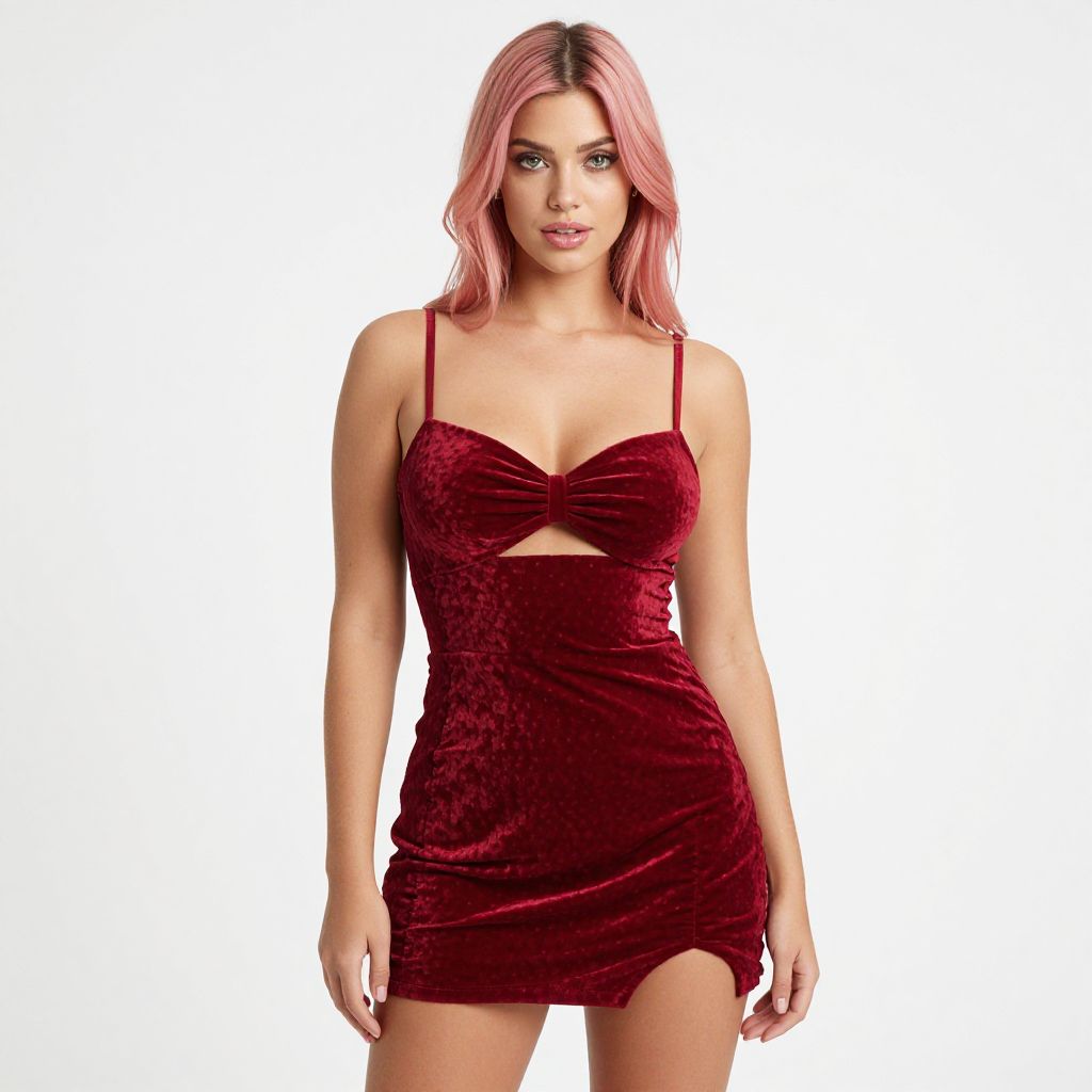 "Woman, contemporary party wear, velvet mini dress in deep red, sweetheart neckline, spaghetti straps, front twist detail with cut-out, ruched sides, asymmetrical hem, pink hair, white studio background.. Sexy. Pretty face and beаutiful eyes. Big breasts."