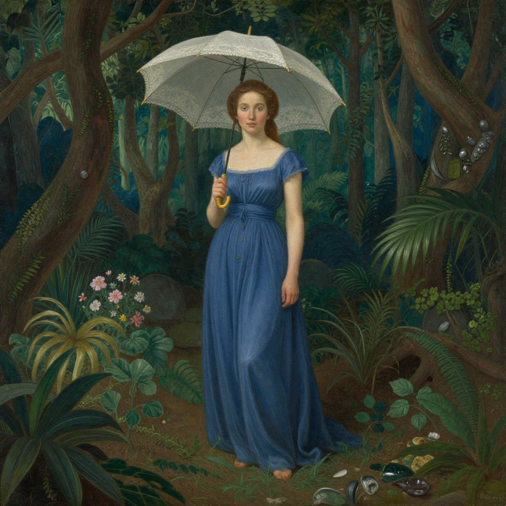 Victorian-style painting of a fair-skinned woman in a blue dress holding a lace umbrella, standing in a lush, dark forest with ferns and