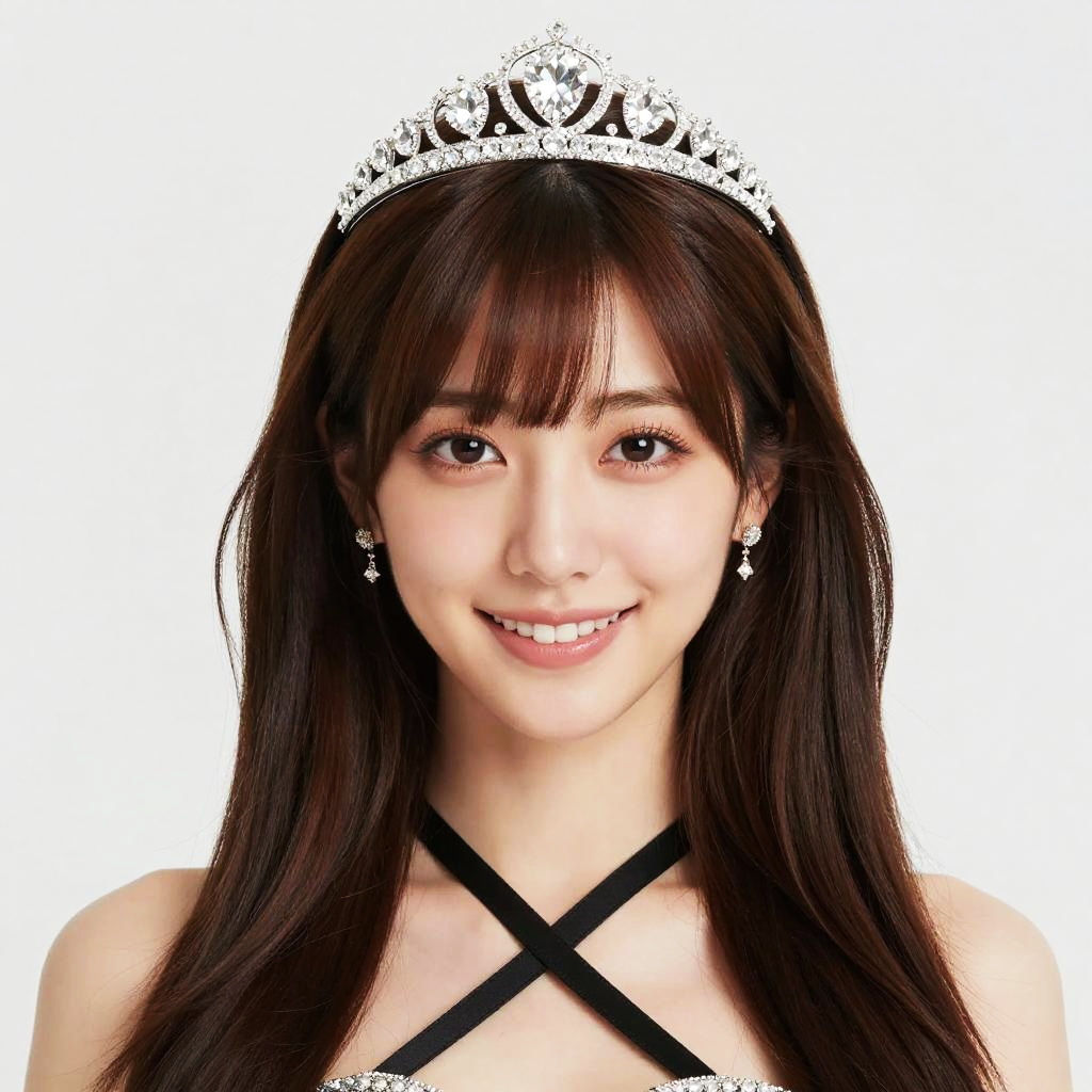 Photograph of an Asian woman with long brown hair, wearing a silver tiara, black crisscross strap dress, and pearl earrings, smiling against
