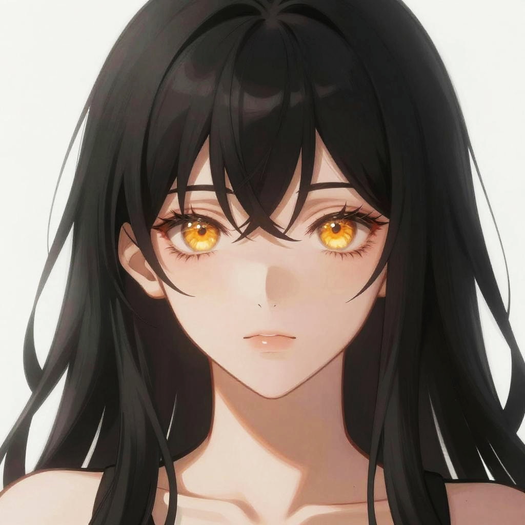 Black hair and amber eyes, elegant character design with long black hair and striking amber eyes, soft lighting, highly detailed digital painting, anime style