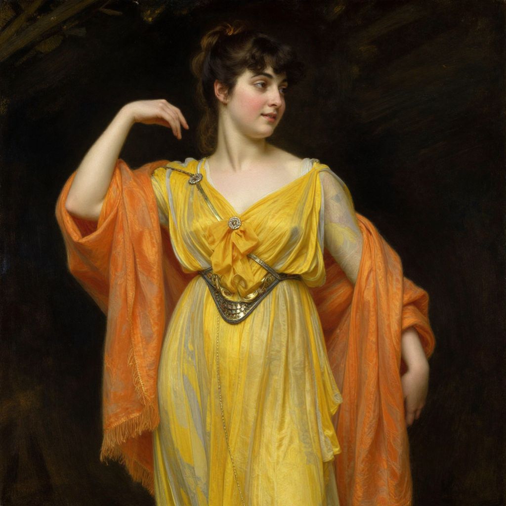 A classical oil painting reminiscent of Frederic Lord Leighton's style, featuring a woman in a vibrant yellow dress adorned with a decorative belt, draped in an orange shawl, and set against a dark background with dramatic lighting, evoking a timeless and romantic aesthetic.