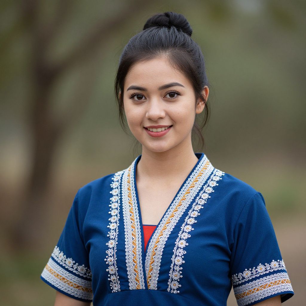 Photograph of a young Asian woman with fair skin and black hair in a bun, smiling gently. She wears a navy blue traditional blouse with white and gold embroidered patterns along the neckline and sleeves. The background is blurred, featuring green and brown hues, suggesting an outdoor, natural setting. Her makeup is minimal, emphasizing her natural beauty. The blouse's texture appears soft and slightly flowy, contrasting with the blurred, tree-filled background. Her expression is calm and approachable.