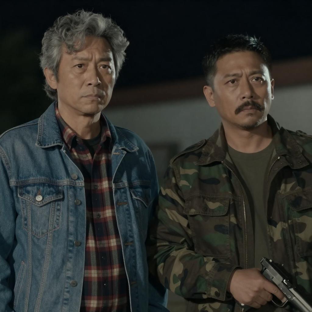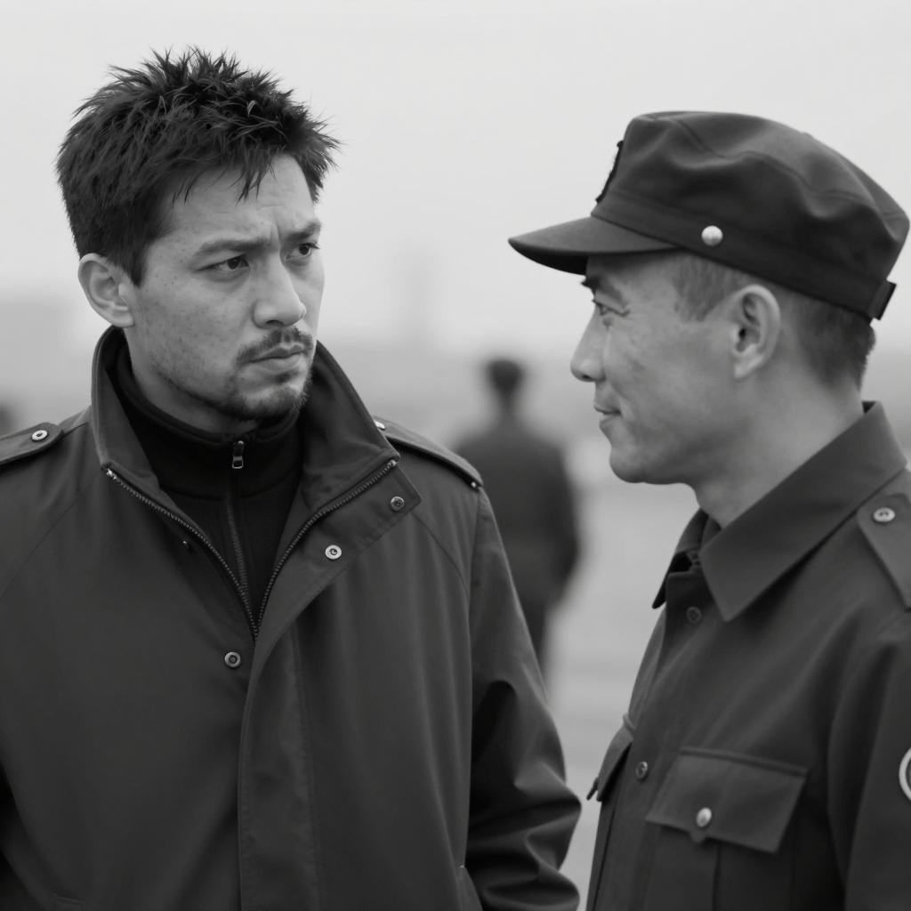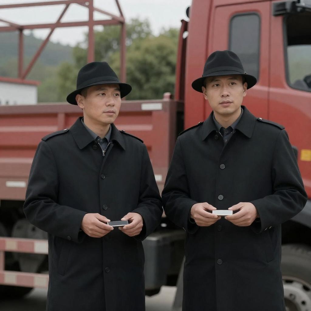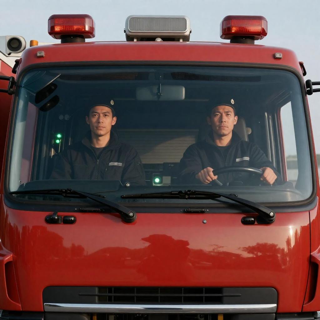 Photograph of a red fire truck with two men inside. Both wear black berets and dark clothing. The driver on the right holds the steering wheel, with a serious expression. The passenger on the left has a neutral expression. Green-tinted interior lighting. Two antennas on the truck's front.