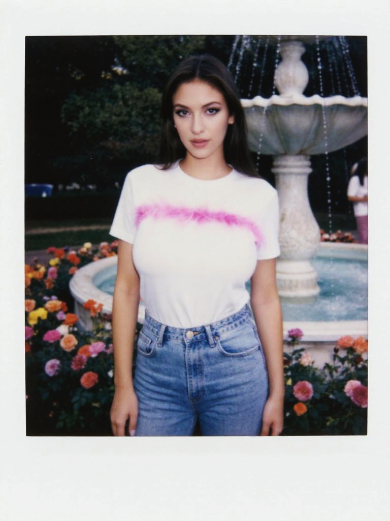 A willowy woman in a casual leopard print top and slim-fit burgundy trousers stands by a serene lily pond in a botanical garden, captured in the nostalgic style of a polaroid instant camera. Sexy. Pretty face and beаutiful eyes. Big breasts
