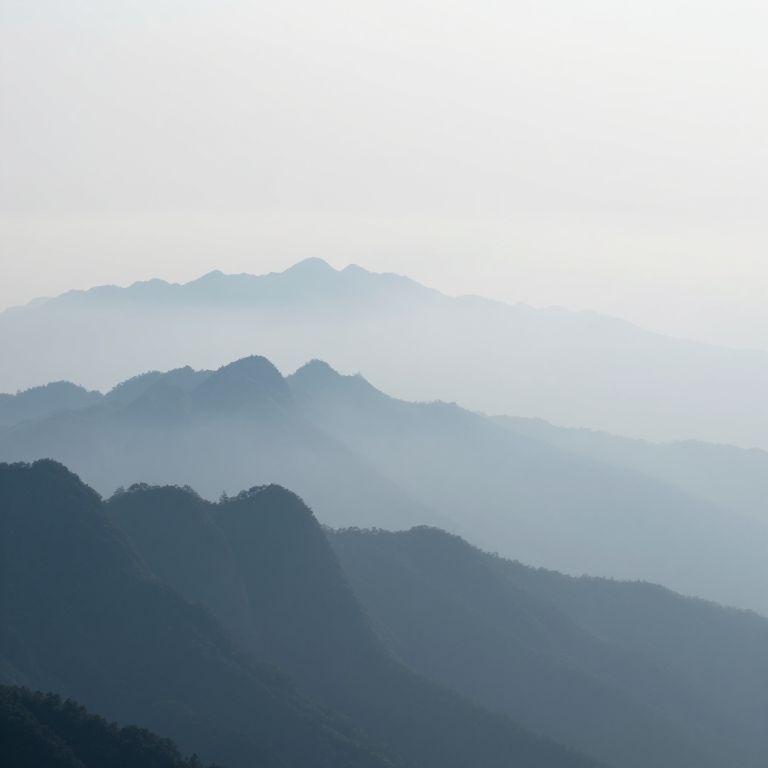 Photograph of a misty mountain range. The image features multiple layers of dark blue and gray mountain silhouettes, gradually fading into the misty, light blue background. The mountains are positioned in the lower half of the image, with the mist creating a soft gradient that extends to the upper half, giving a sense of depth and distance. The sky is overexposed and almost white, contrasting with the darker mountains. The overall composition is minimalistic, emphasizing the serene and ethereal atmosphere of the mist-covered landscape.
