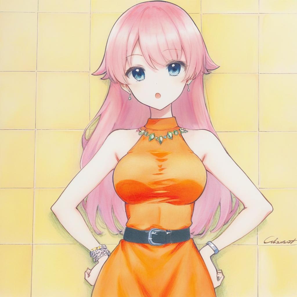 Illustration of an anime girl with long pink hair and large blue eyes, wearing a sleeveless orange halterneck dress with a black belt. She has jewelry including earrings, a necklace with green gems, bracelets, and lipstick. The girl is standing with her hands on her hips against a tiled yellow wall. The artwork is created using traditional media and features a signature on the right side.
