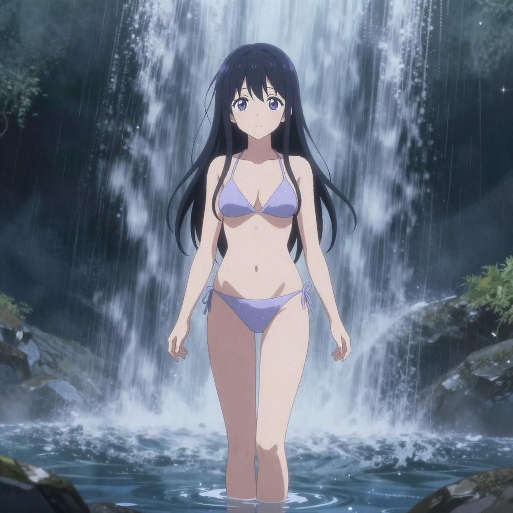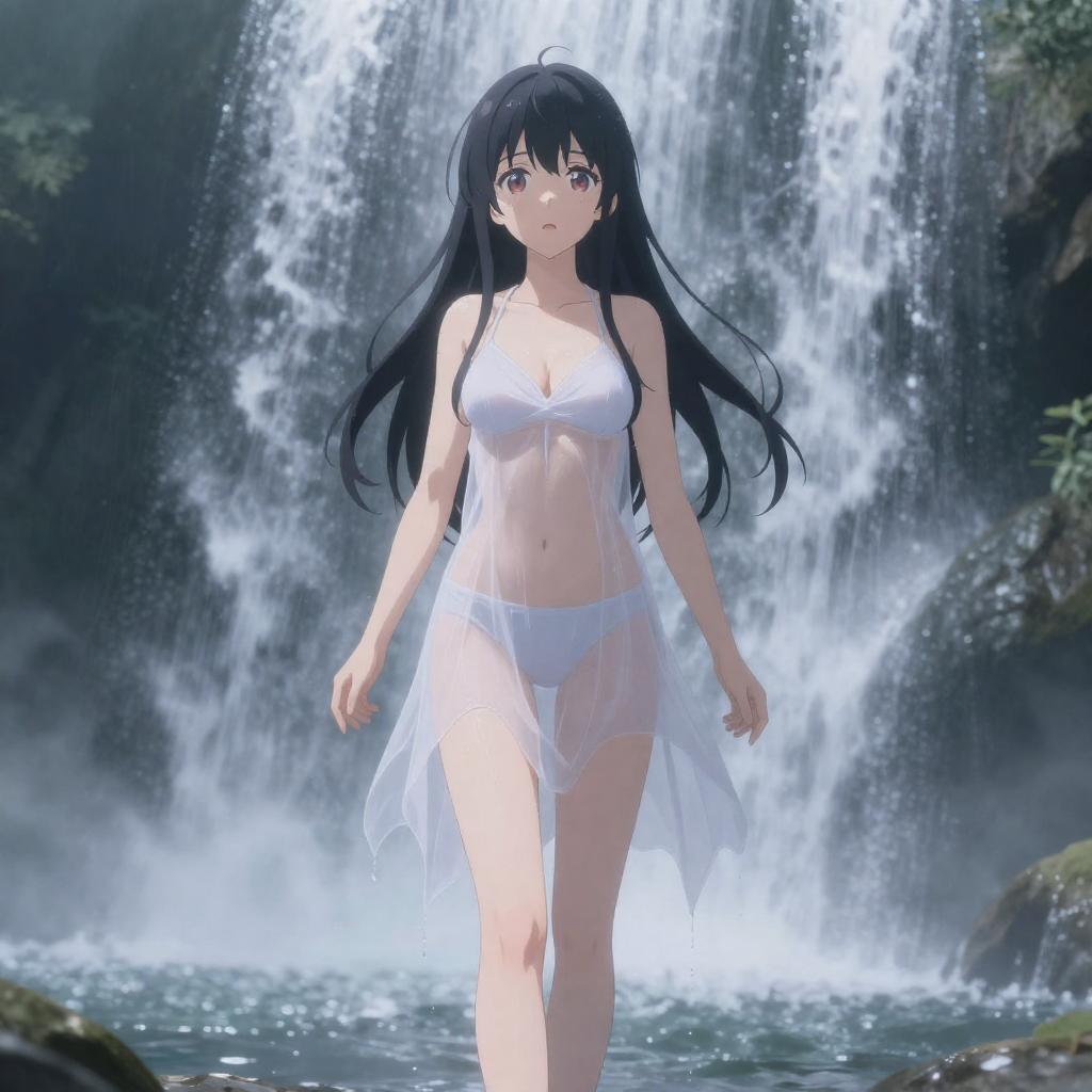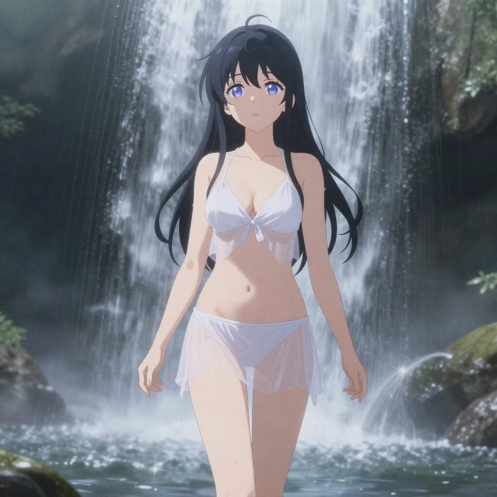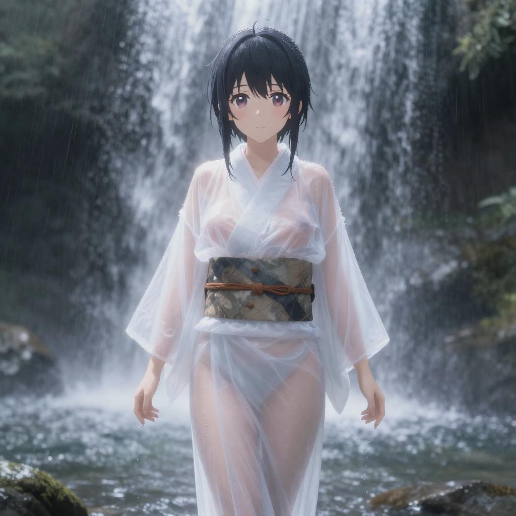 Ecchi art of frost shrine maiden standing under a cascading waterfall, drenched icy-blue frostwoven robes clinging to her figure, shimmering snowflake aura surrounding her, cold yet alluring anime aesthetic
