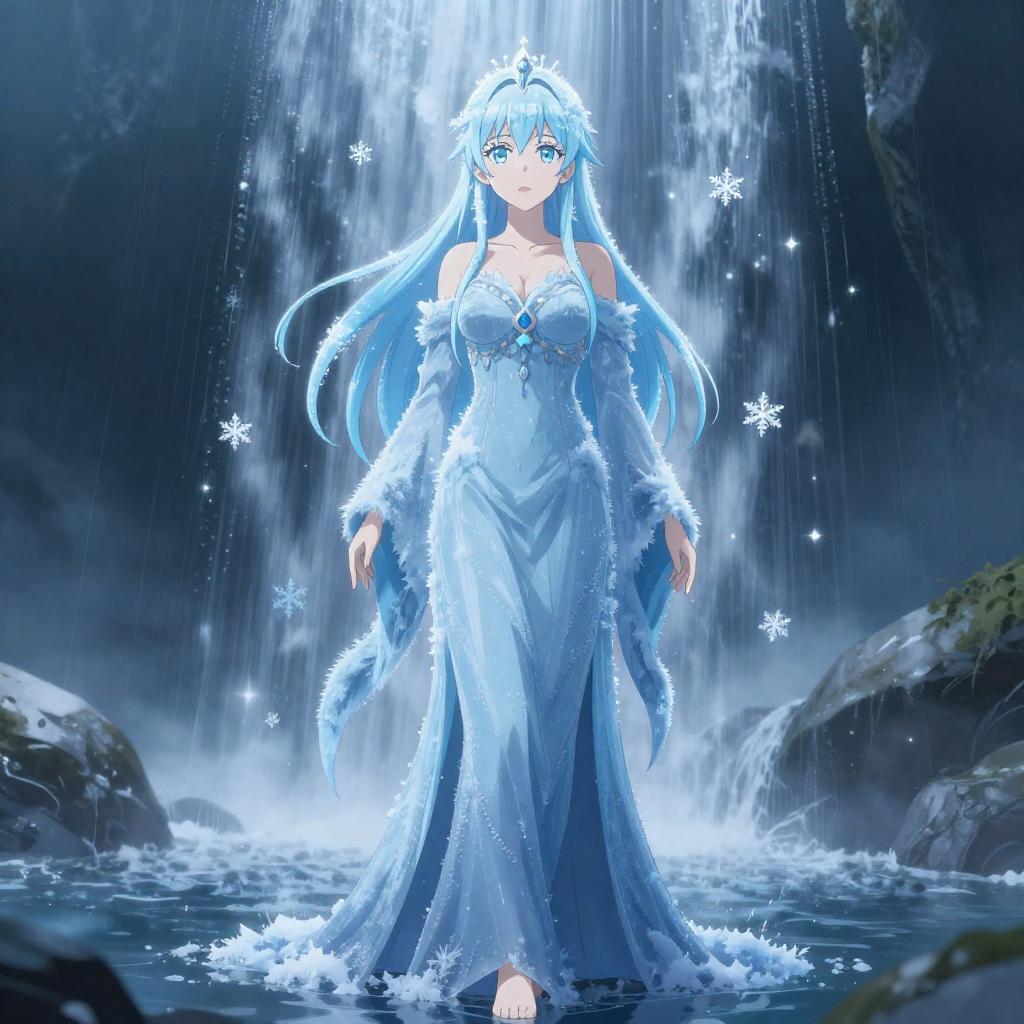 Anime-style illustration of a frost shrine maiden standing barefoot under a cascading waterfall. She wears icy-blue frostwoven robes that cling to her figure, adorned with white fur accents. A shimmering snowflake aura surrounds her, creating a cold yet alluring atmosphere. The background features misty rocks and flowing water, enhancing the ethereal and magical aesthetic.