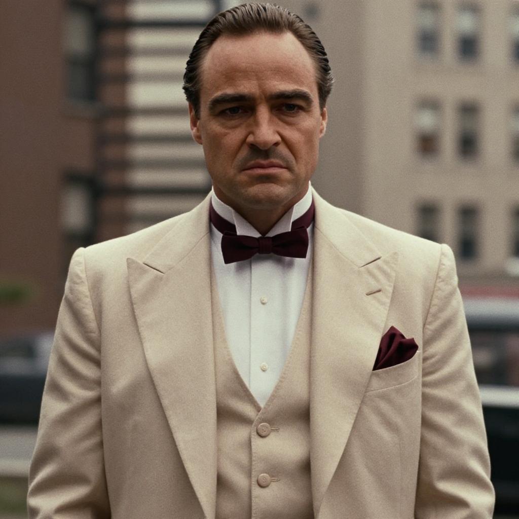 Godfather dress, photorealistic portrait of a handsome man, short brown hair, styled neatly, wearing a beige suit, white shirt, maroon bow tie, maroon pocket square, serious expression, urban background with blurred buildings, daytime, realistic lighting, close-up, detailed ures, high quality