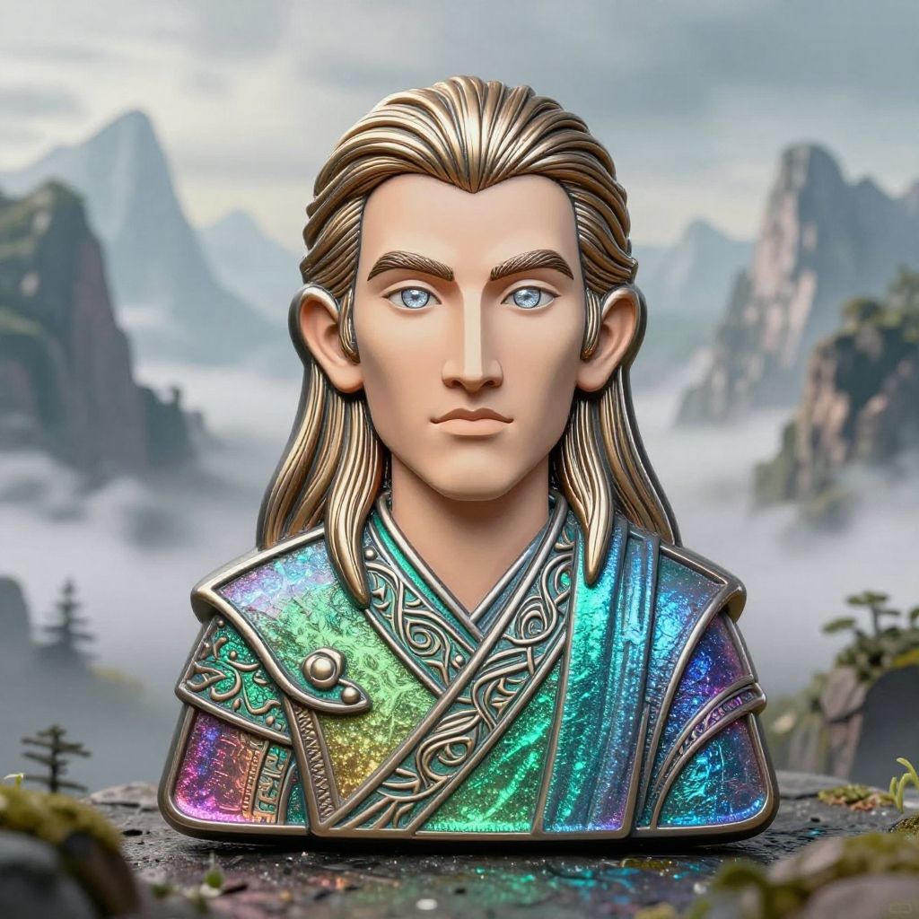 This digital art portrait features a fair-skinned, blue-eyed young man with long, straight, blonde hair. He wears a vibrant, metallic, rainbow-colored jacket adorned with intricate silver patterns. The background is a misty, mountainous landscape with rocky outcrops and small trees. The image has a fantasy, CGI style, with realistic textures on the character's face and hair, and a glossy finish on the jacket. The subject's expression is neutral, and he is centered in the frame, looking directly at the viewer. The overall mood is mystical and otherworldly.