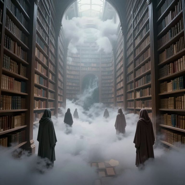 In a hazy realm where knowledge floats like ethereal clouds, cloaked figures navigate the infinite corridors of a dream-library, their steps whispering secrets of forgotten worlds and the quiet promise of boundless imagination.