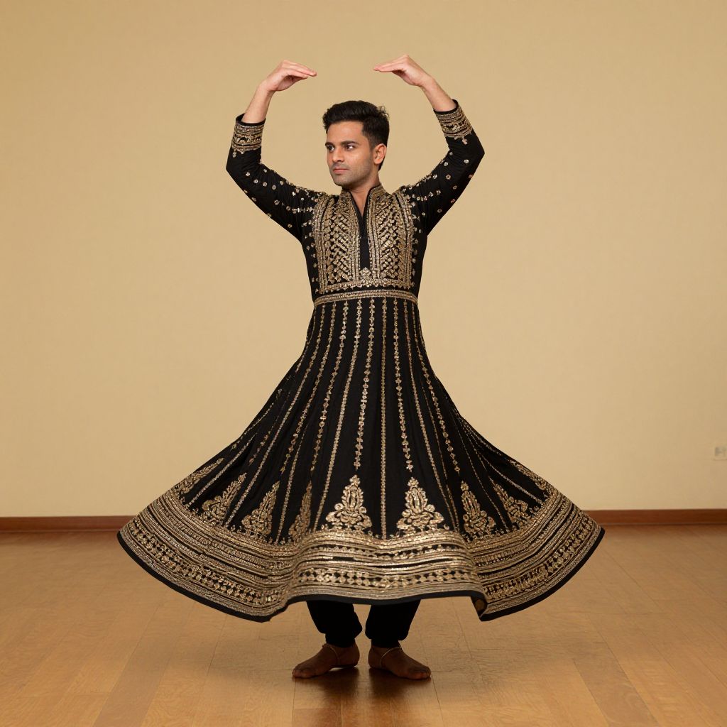 Indo Western Costume Dance, man in a traditional indian dress standing on a wooden floor