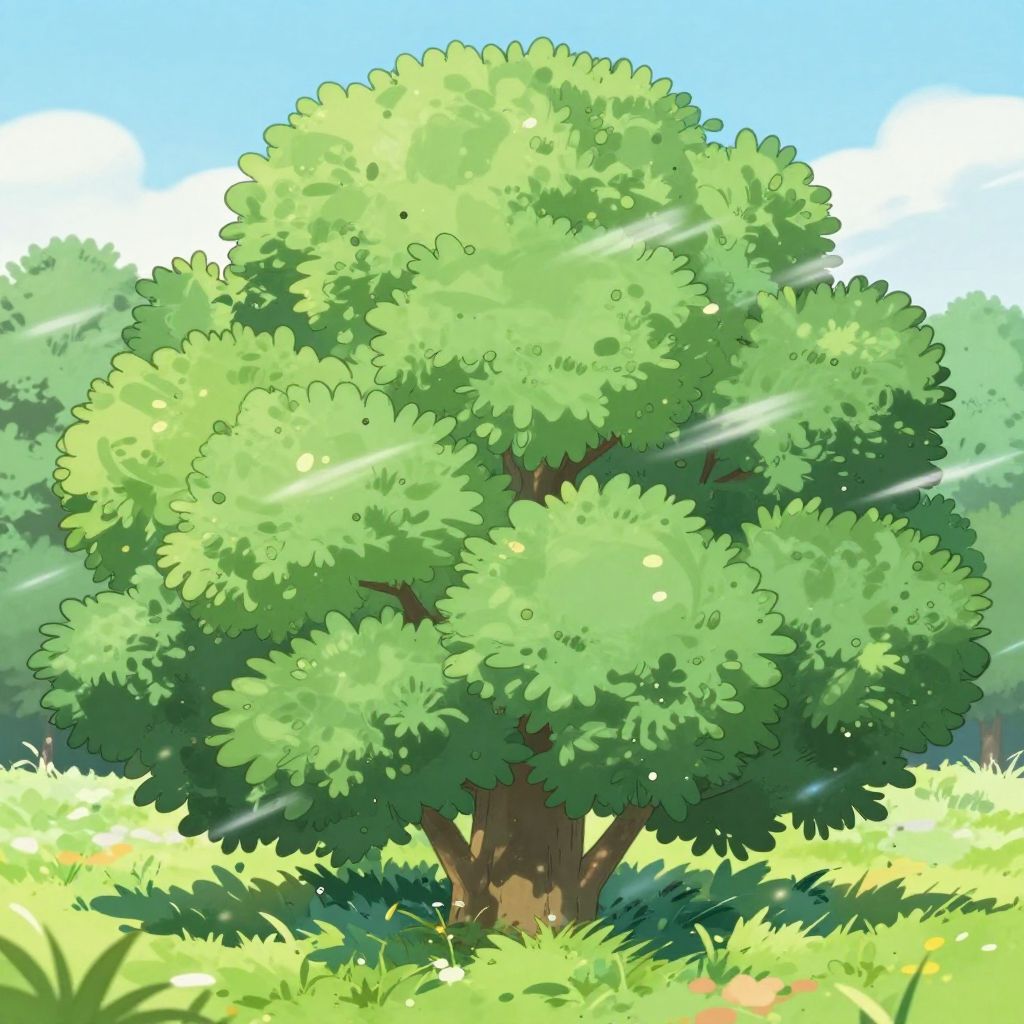 Anime bush drawing showing a cluster of wild bushes with exaggerated leaf shapes and vibrant color palette, incorporating gentle motion blur to suggest a light breeze, set in a bright, animated outdoor setting with soft lighting effects