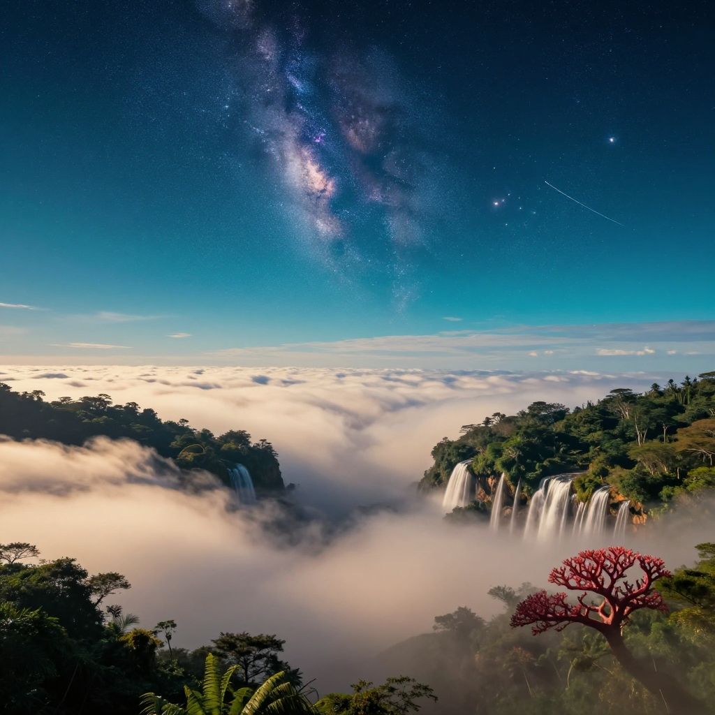 Photograph of a breathtaking, surreal landscape featuring cascading waterfalls surrounded by lush, green tropical trees. The scene is enveloped in a layer of white, fluffy clouds at the base. Above, the night sky is vividly displayed with a stunning Milky Way galaxy, dotted with stars, and a bright shooting star. A deep blue gradient sky transitions to lighter hues near the horizon. In the foreground, a vivid red tree stands out against the greenery. The overall composition combines natural beauty with celestial wonder, creating a dreamlike atmosphere.