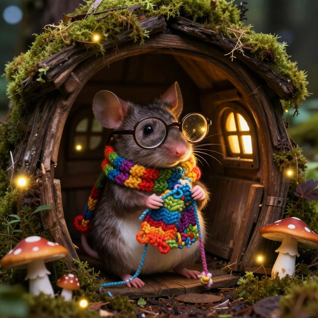 Mole rat with glasses perched on a small rock in a forest clearing, oversized circular glasses reflecting the canopy above, intricate detail on the fur and whiskers, warm golden hour sunlight filtering through leaves, a blend of realism and charming cartoon aesthetics.