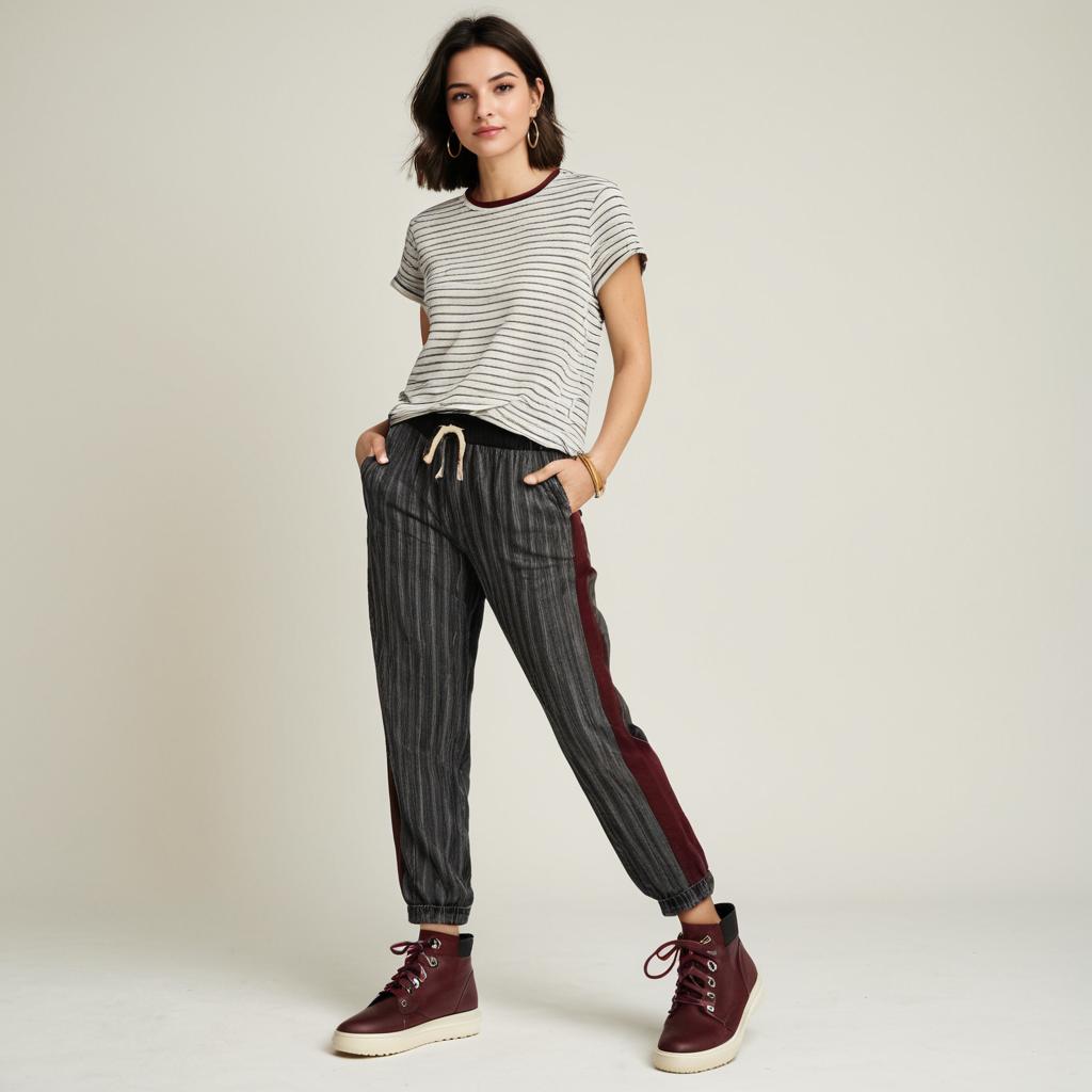 Woman, casual contemporary, faded charcoal jogger-style jeans, drawstring waist, cuffed ankles, relaxed fit, off-white t-shirt with abstract black and grey horizontal stripes, short sleeves, round neckline, maroon leather ankle boots with gold trim, simple stud earrings, plain studio background