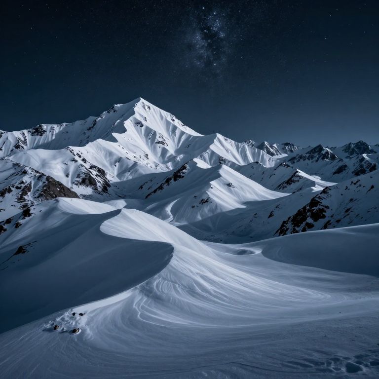 Photograph of a snow-covered mountain range under a starry night sky, with illuminated peaks and swirling snow patterns in the foreground.