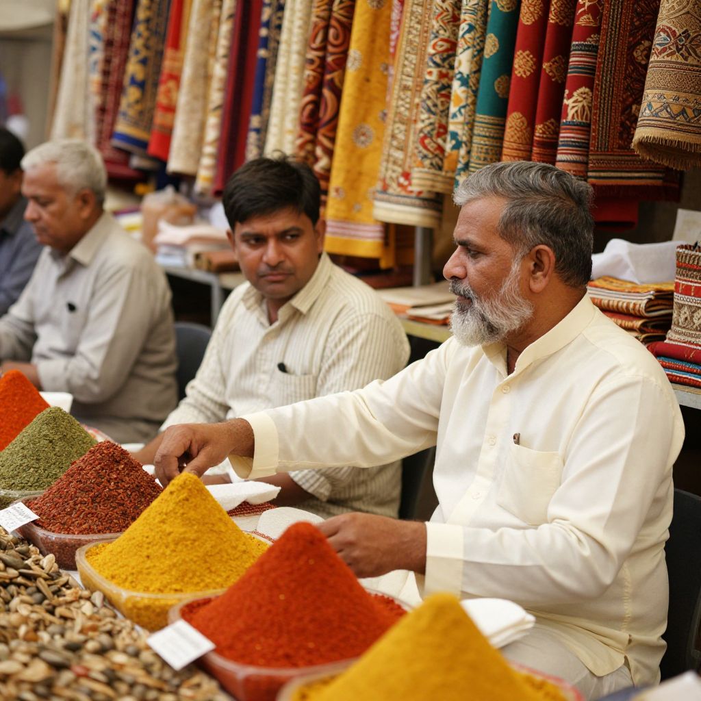 Indian men with beard working at a traditional crafts market, vibrant stalls around, colorful spices and fabrics, engaged in conversation, medium shot with warm tones, intricate beard styling, ambient natural light capturing authentic cultural scene