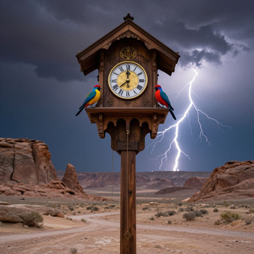 Surreal desert landscape anchored by a towering wooden cuckoo clock, its golden face marked with Roman numerals, flanked by two colorful birds perched on its ledge, set against a backdrop of jagged rock formations, swirling clouds, and dramatic lightning bolts illuminating the night sky.