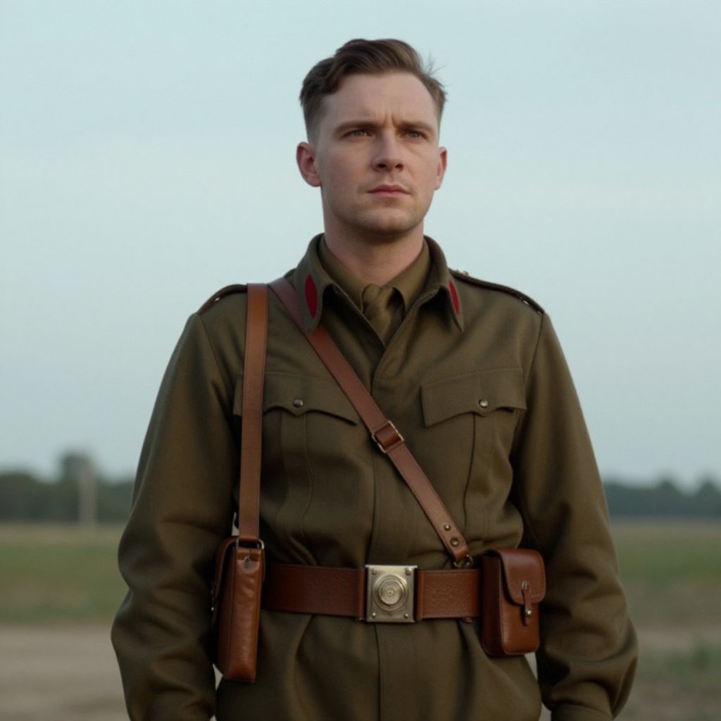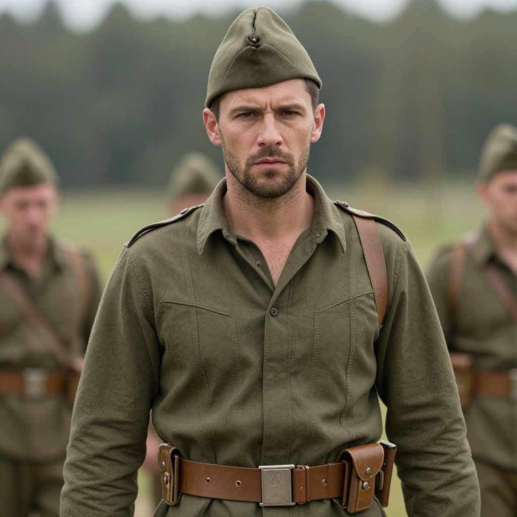 A young Spartan leader dressed in traditional olive drab military attire with leather straps and belt, passionately giving a rousing speech to his assembled army. Sunlight streams through clouds, casting golden hues over the scene, evoking a sense of hope and inspiration among the soldiers wearing helmets and uniformed clothing in the background.
