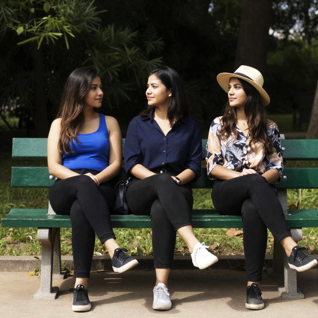 A photograph of two young women smiling and leaning over a table. The woman in the foreground has dark hair, glasses, and wears a yellow shirt. The woman behind her has dark hair, wears a black shirt, and rests her head on her hand. The table in front of them is filled with glass jars containing orange syrup and floral-patterned paper cups. A guitar is also placed on the table. The background features colorful diagonal stripes and a blurred poster.