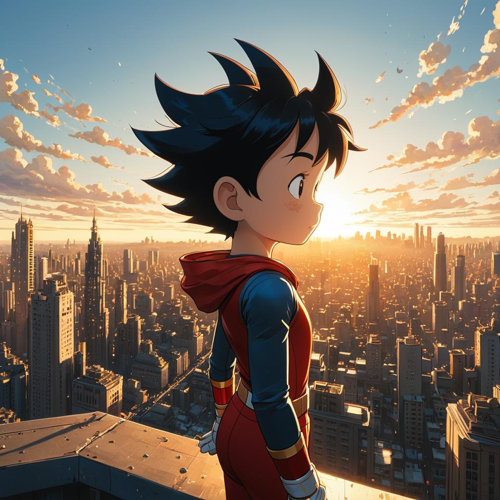 Digital painting of the anime character Astro Boy standing on a rooftop, overlooking a sprawling, modern cityscape during golden hour. The artwork features warm sunlight casting long shadows and illuminating the clouds in a dramatic sky. The character wears a red and blue outfit with gold accents, capturing a blend of futuristic and classic anime styles. This high-resolution concept art showcases detailed architecture and atmospheric lighting inspired by renowned digital artists.