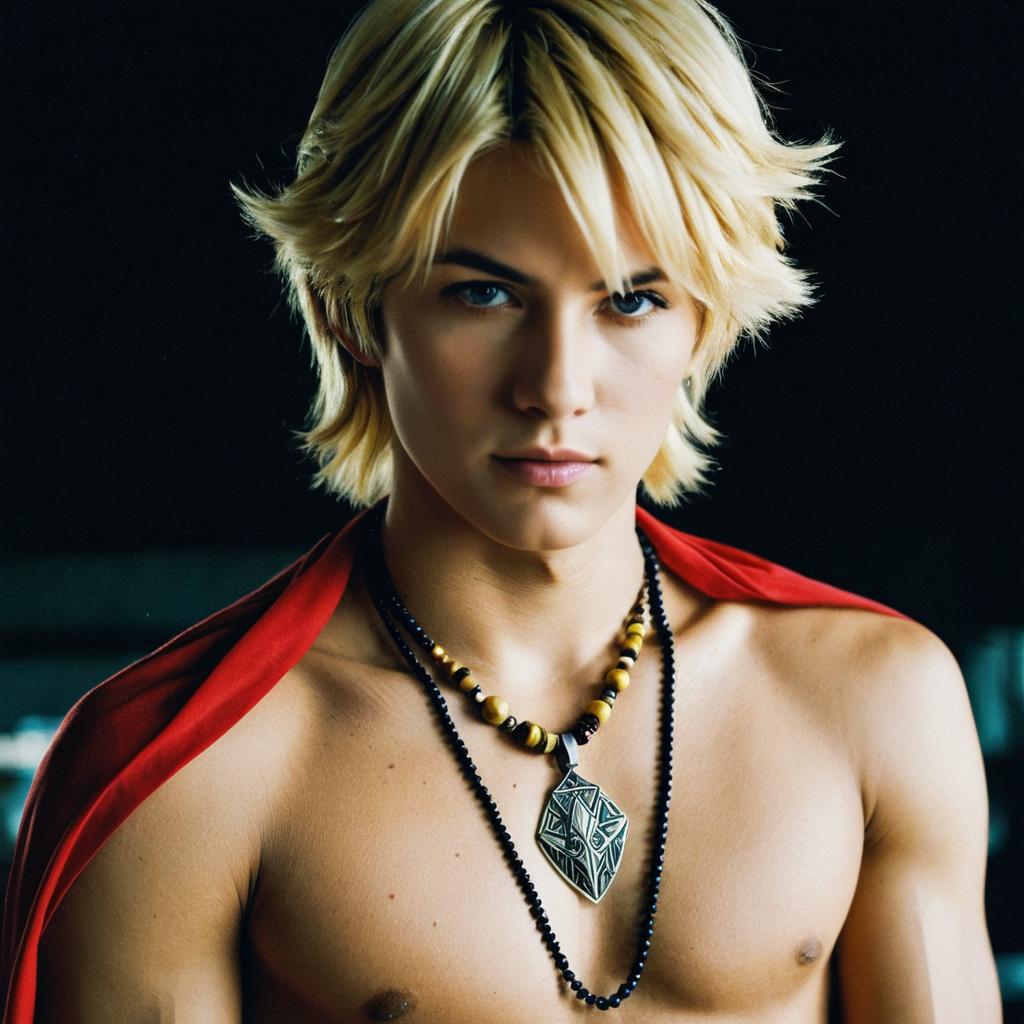 Portrait of a shirtless young Caucasian man with a classic blonde mullet hairstyle and symmetrical tattoos on his upper arms. He has a muscular upper body and is looking directly at the camera. In the background, a slightly blurred figure of the same man wearing a white tank top is visible.