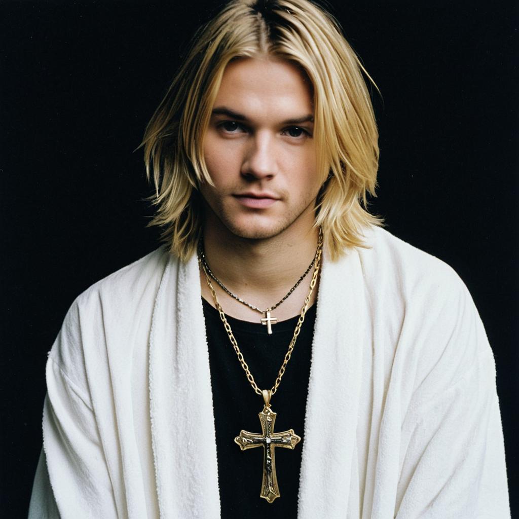 Classic mullet hairstyle,1boy, male focus, solo, realistic, nipples, pectorals, blonde hair, looking at viewer, upper body, tattoo, shirt