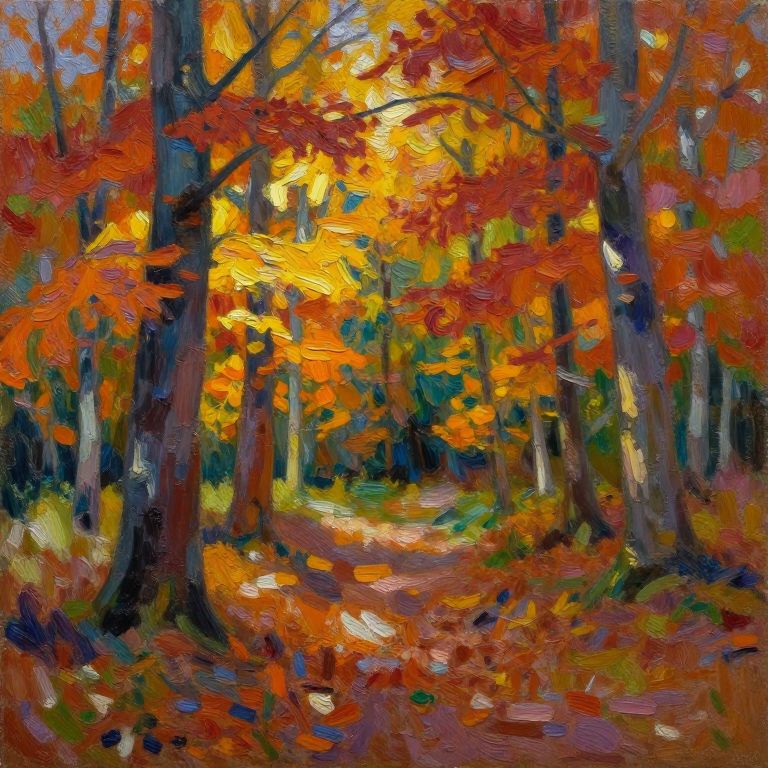Vibrant autumn forest painting with thick, expressive brushstrokes, showcasing bright orange, red, and yellow leaves, and dark tree trunks on