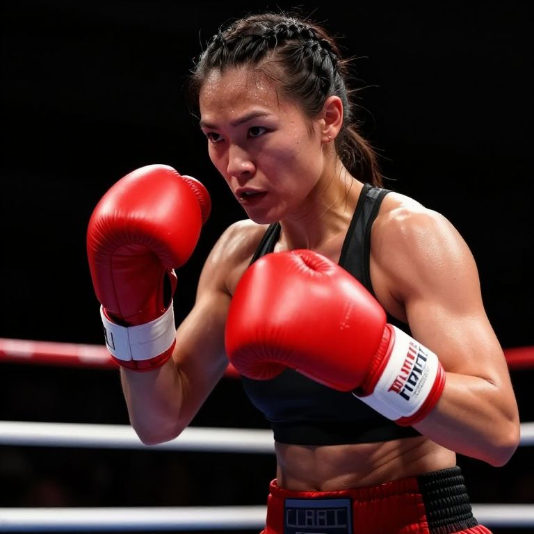 Photograph of an Asian female boxer with a muscular build, sweaty skin, and dark, wet hair tied back. She's wearing a black sports bra and red boxing gloves with white wrist wraps. Her right glove is raised in a defensive stance while her left glove is slightly lowered. She has a focused, intense expression, with visible determination in her eyes. The background is dark, emphasizing the bright red of her gloves and the white and red boxing ring ropes. The image is sharp with high contrast, capturing the intensity and athleticism of the moment.