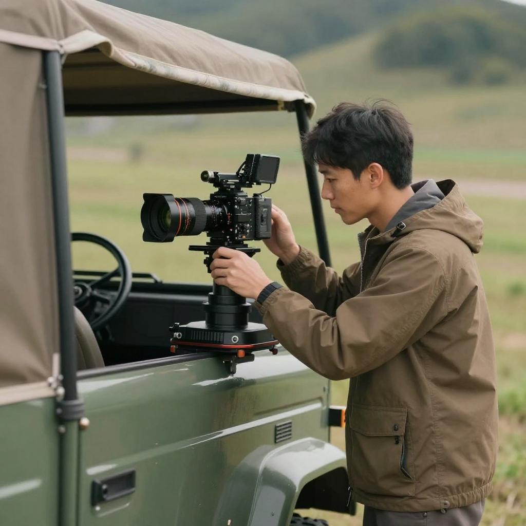 A young man with short black hair wearing a brown jacket operates a large professional video camera mounted on the side of a green rugged off-road vehicle with a canvas roof. The photo is taken outdoors in a grassy field with natural sunlight, featuring a shallow depth of field to emphasize the subject and vehicle.