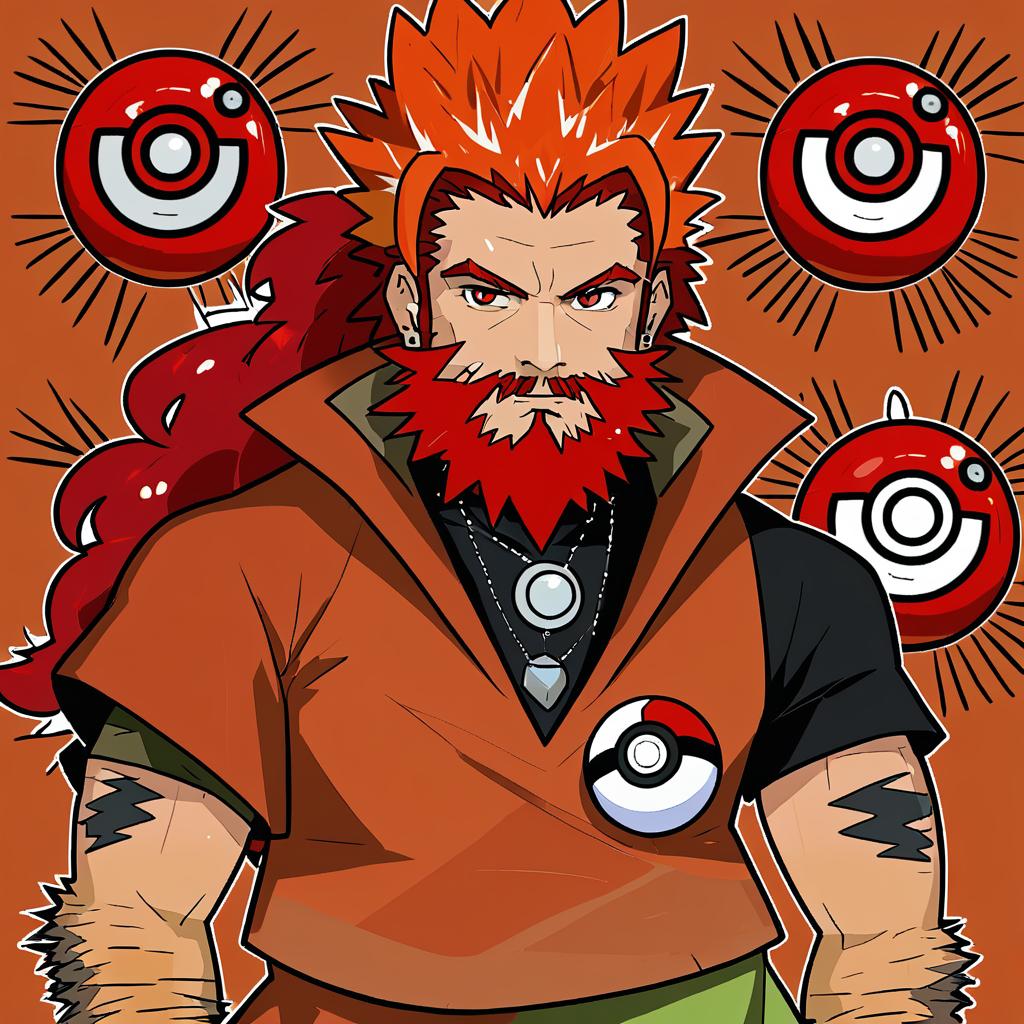 Anime-style illustration of a muscular male Pokémon trainer with spiked, long two-tone orange and red hair tied in a ponytail. The character has a prominent red beard, facial hair, and arm hair, wearing a popped-collar poncho and a black shirt underneath. He has a Poké Ball emblem on his chest and is surrounded by floating Poké Balls. The character wears necklaces and has tribal tattoos on both arms, set against an orange background.