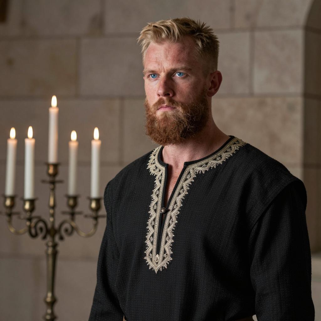 Bearded man with short blonde hair, intense blue eyes, wearing a black, intricately embroidered medieval tunic. Stone wall background with a metal candelabrum holding four candles on the left. Man stands slightly off-center, looking forward.