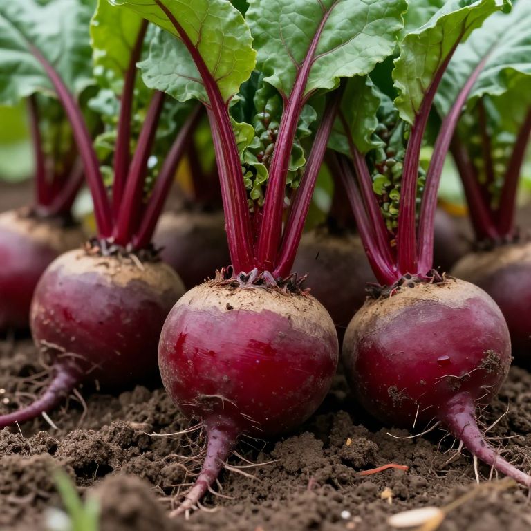Photograph of a cluster of freshly dug beets with vibrant red and purple roots, green leafy tops, and deep purple stems standing upright in dark, moist soil. The beets are round with visible dirt and roots extend downward. The leafy tops are lush and slightly curled, contrasting with the rich soil. The background is slightly blurred, emphasizing the foreground beets. The image has a sharp focus on the beets, highlighting their texture and color. The lighting is natural, enhancing the vividness of the beets and leaves.