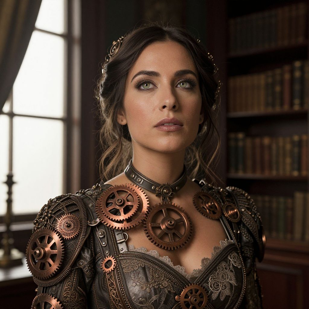 Photograph of a woman with light olive skin and dark brown, wavy hair adorned with a metallic headpiece. She has piercing blue eyes and wears a dark, Victorian-style dress embellished with large copper gears and intricate lace. A matching copper choker with gears rests around her neck. The background features a dimly lit, wood-paneled library with bookshelves filled with books and a window allowing light to filter in. The overall style is steampunk, combining historical and industrial elements. The woman's expression is intense and focused, adding a sense of mystery and intrigue to the image.