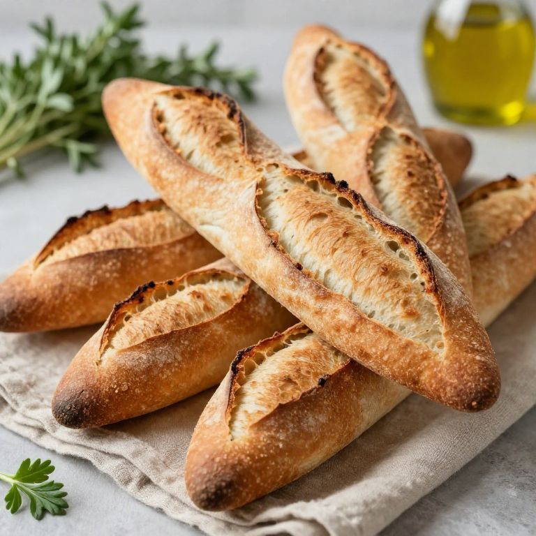 Close-up of baguettes with a crunchy exterior and soft, airy crumb, arranged artistically on a linen cloth, rustic kitchen environment with herbs and olive oil, soft natural light highlighting the golden-brown crust, emphasizing texture and freshness.