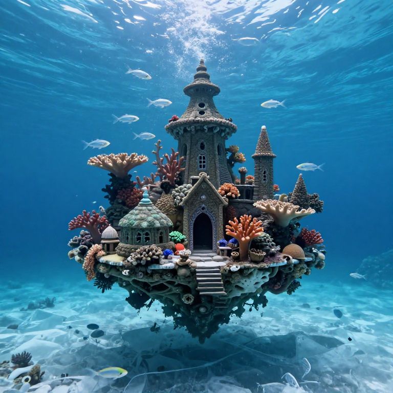 Gothic cathedral spires emerge from a submerged island, their intricate stone architecture encrusted with marine life as vibrant schools of fish swim gracefully around the ancient structure, blending human craftsmanship with the serene depths of the ocean.