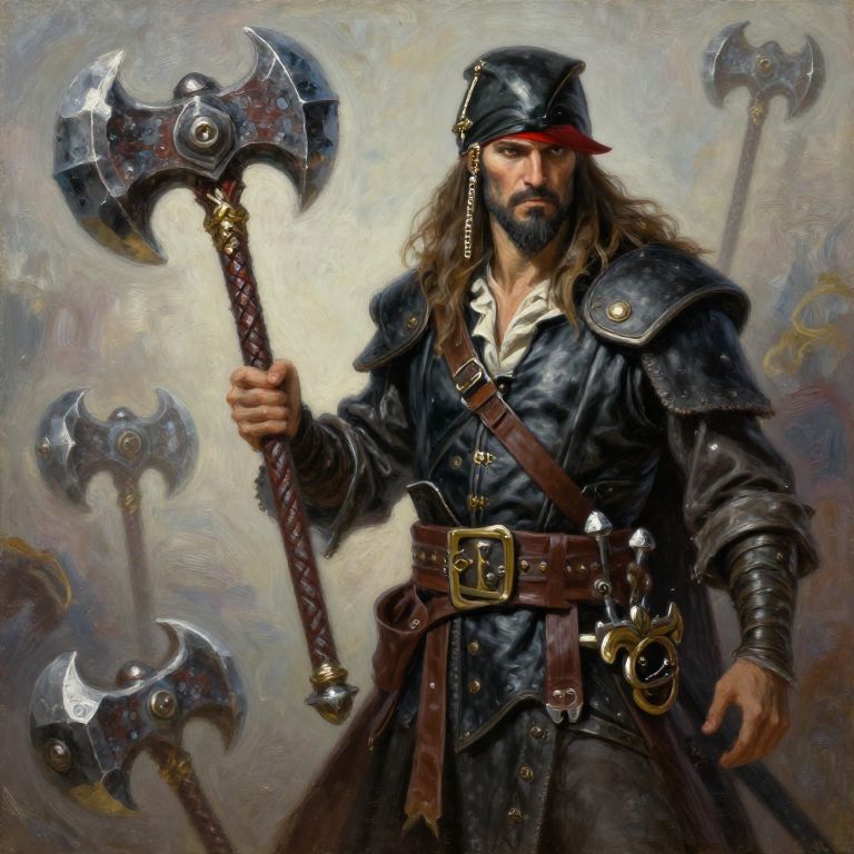 Cosmic Connection pirate cleric mace, D&D style, oil painting, extremely detailed brush strokes, multiple views,