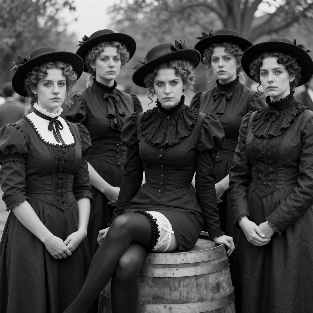 Group of six women in colorful, elaborate 18th-century dresses and hats. Central woman with red lipstick, brown hair in a bun, smiling. Other women have various hairstyles, colorful ribbons, and lace collars. Vivid, bright colors. Close-up. Women interact with laughter and smiles. Background includes a blurred outdoor scene.