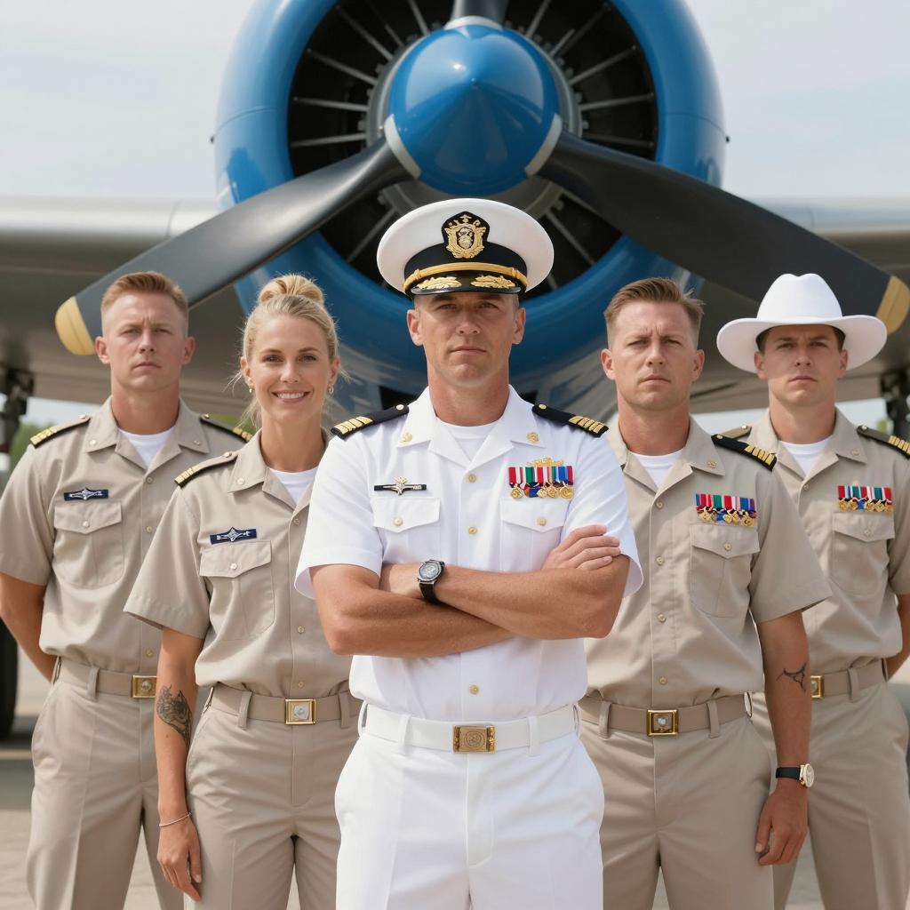 Group of 13 naval officers in white uniforms and caps, saluting. One officer in front, one in black patterned shirt on right. Background: building, ship mast. Sunlight, clear sky. All officers stand in line, facing forward.