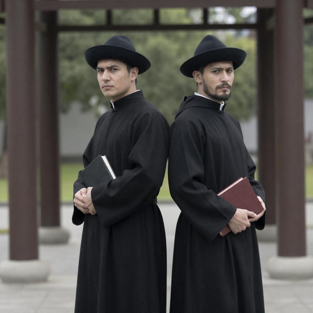 Photograph of two men in white clerical robes with black collars, standing with hands in prayer position. Both men have serious expressions. The man on the left has dark hair, the man on the right has light brown hair. On the left, a colorful stained glass window depicting an Egyptian-style deity with a golden face, red headdress, and green pendant. Background is a stone wall.