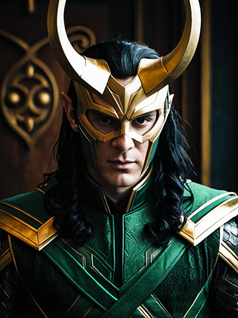 Man in Loki Classic Costume, detailed photorealistic villain portrait