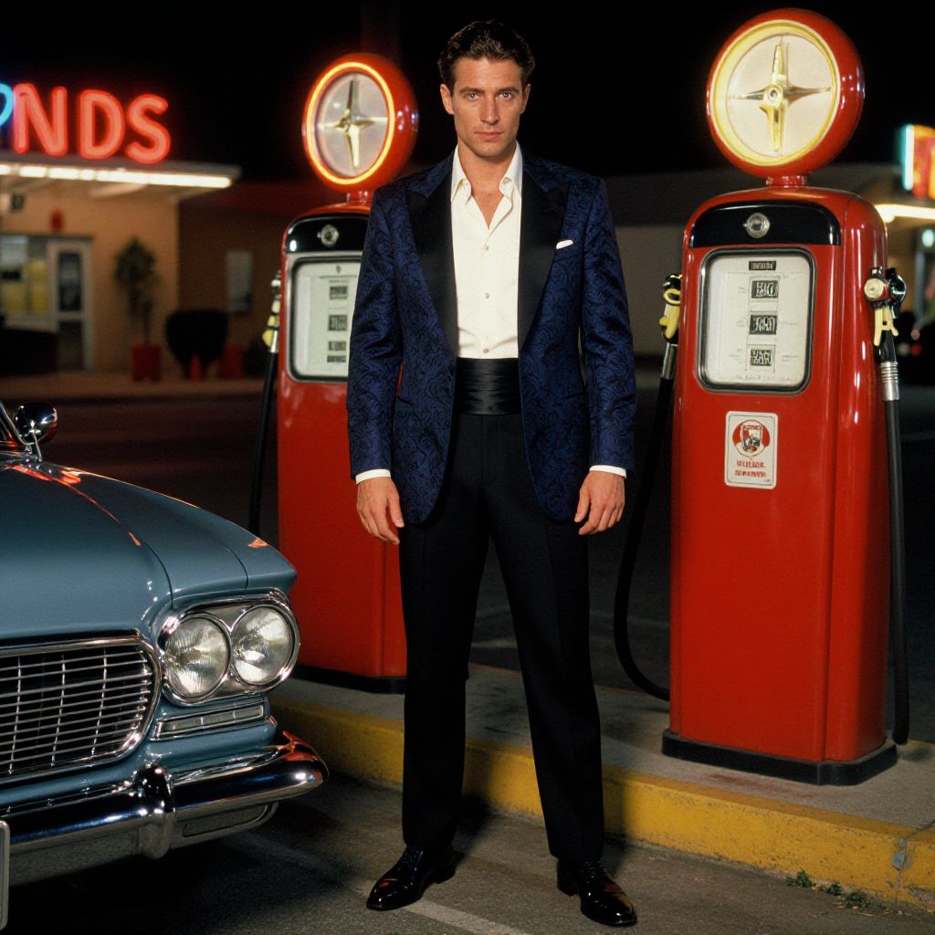 A man, midnight blue brocade tuxedo jacket, ivory cotton dress shirt, black silk cummerbund, slim-fit black trousers, glossy black leather oxfords, classic cars, retro gas pumps, vibrant neon signs, kodachrome analog film, confident expression. Man has masculine face and piercing eyes