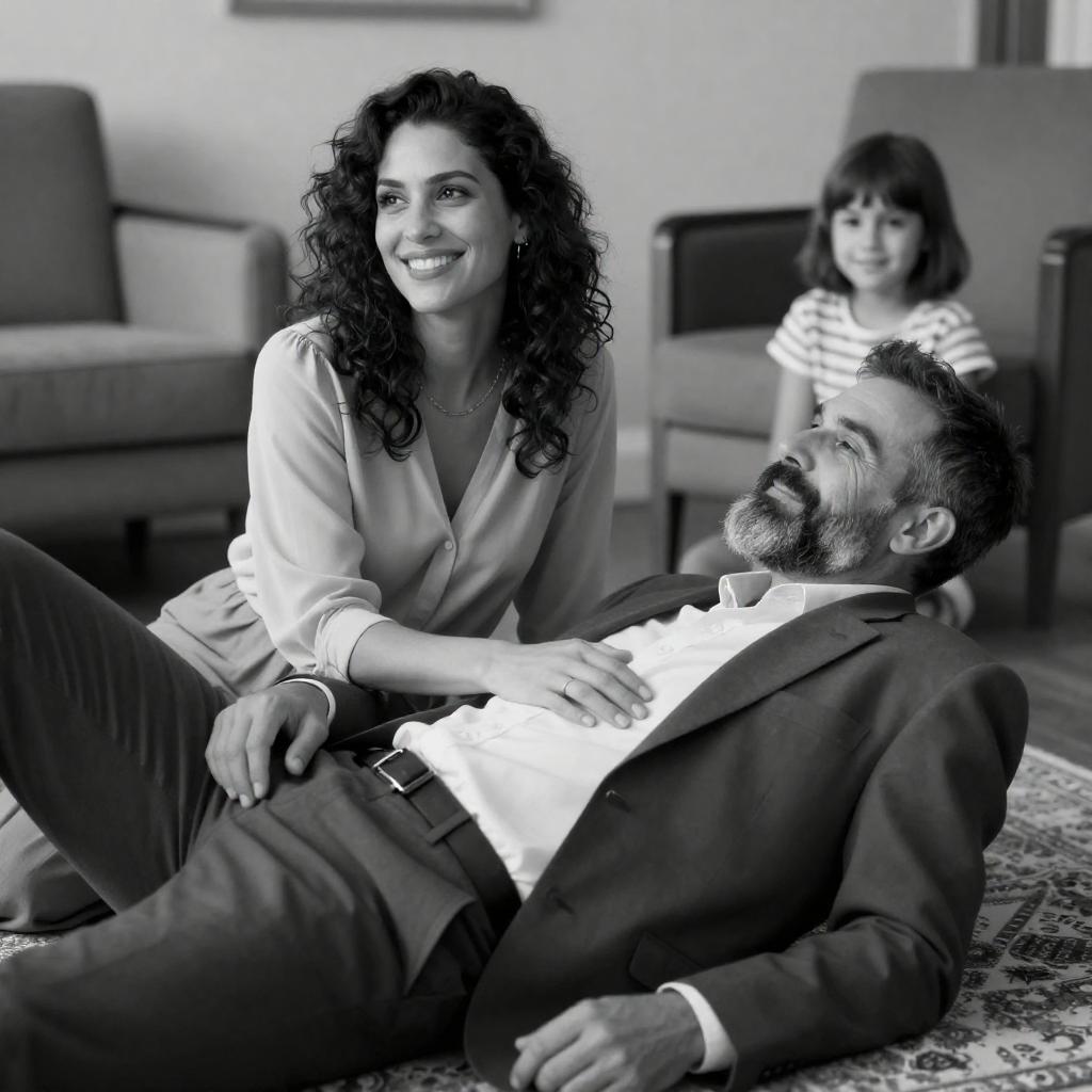 Black and white photograph. Woman with dark, wavy hair and light blouse, smiling, sits on man with graying beard, dark suit, lying on floor. Young girl with short, dark hair, striped shirt, sits in background. Living room with chairs and patterned rug. Man's hand rests on woman's lap. Woman's right hand on man's chest.