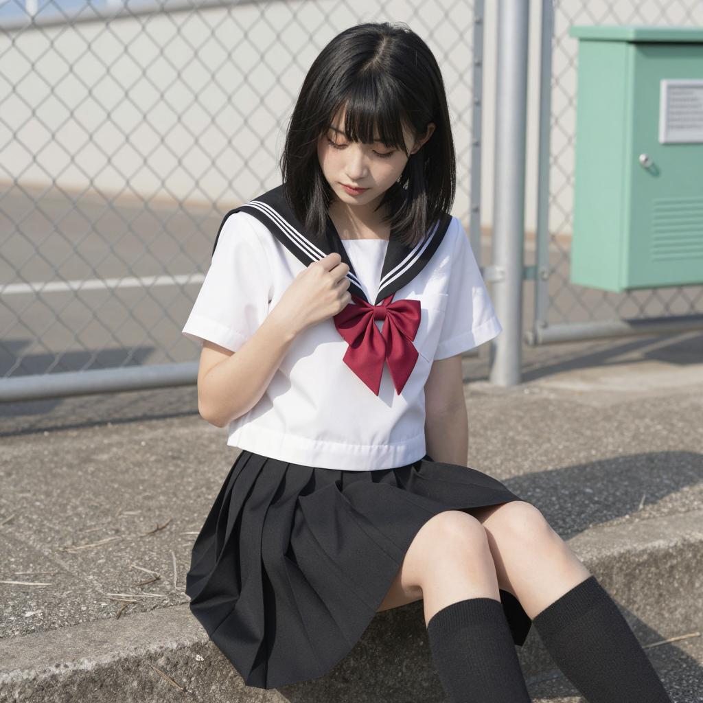 Asian Girl in Sailor Uniform Kneeling Outdoors