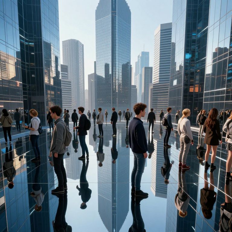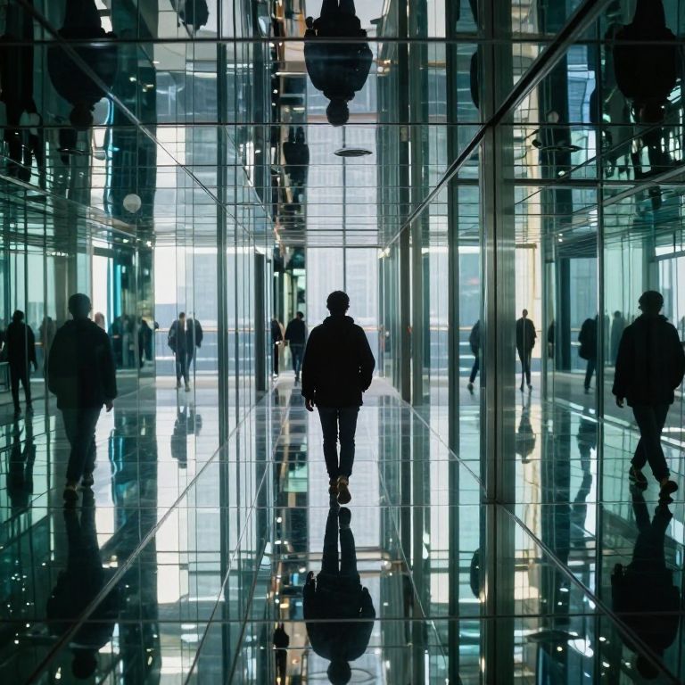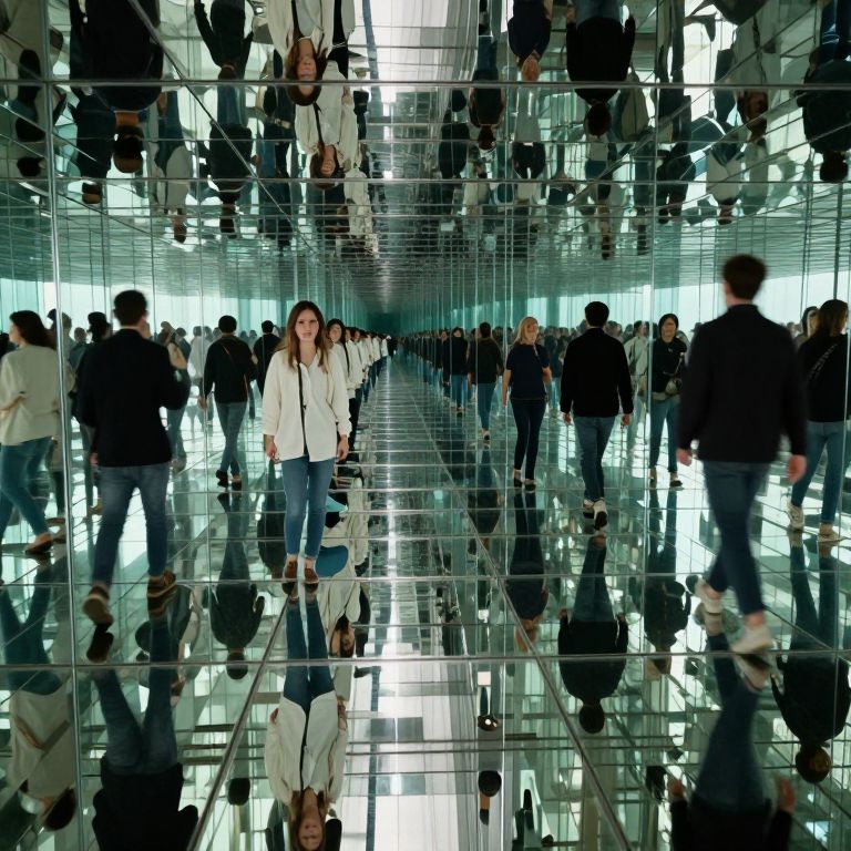In a labyrinthine corridor of endless mirrors, figures dissolve into infinite reflections, creating a surreal tapestry of selves that stretch endlessly into the horizon.