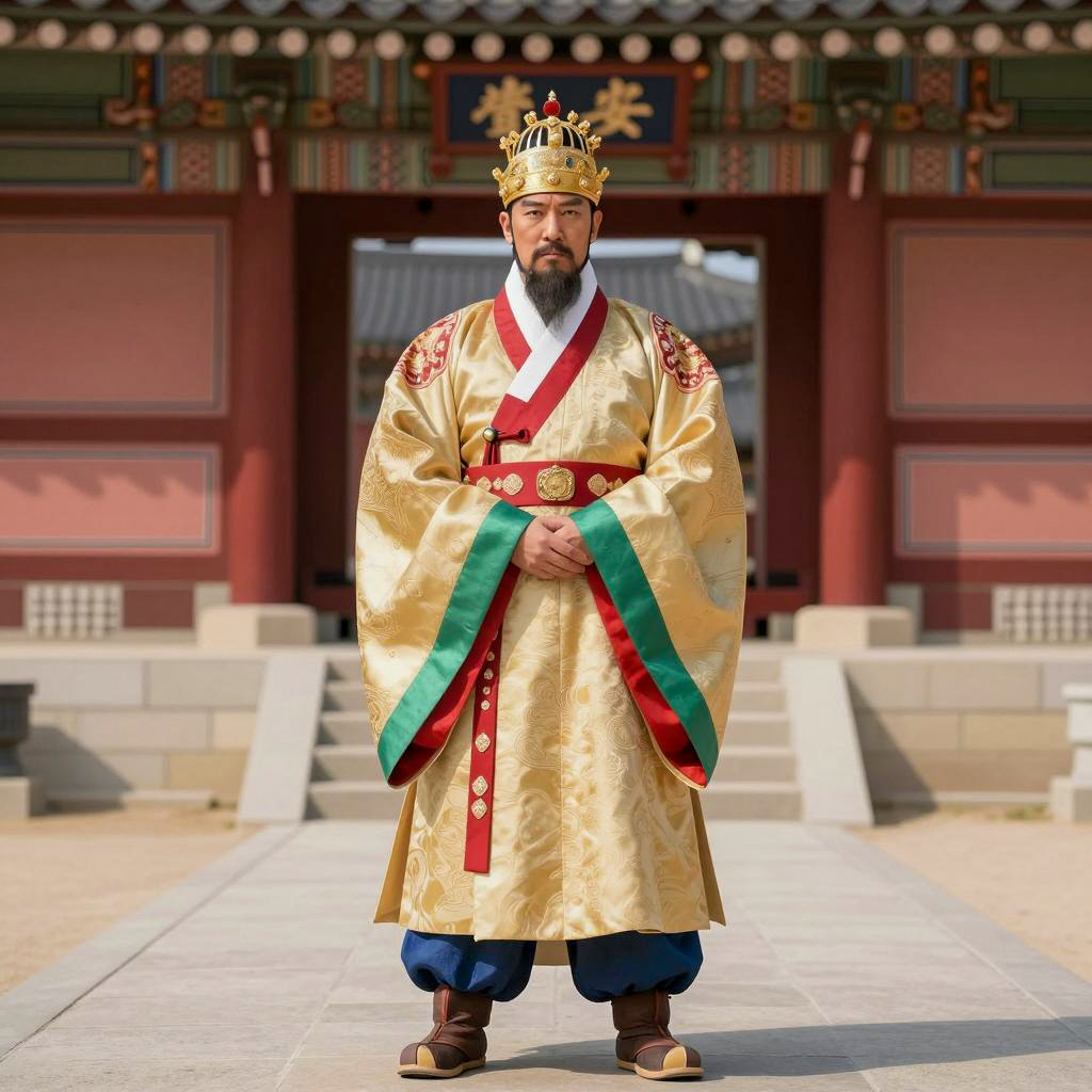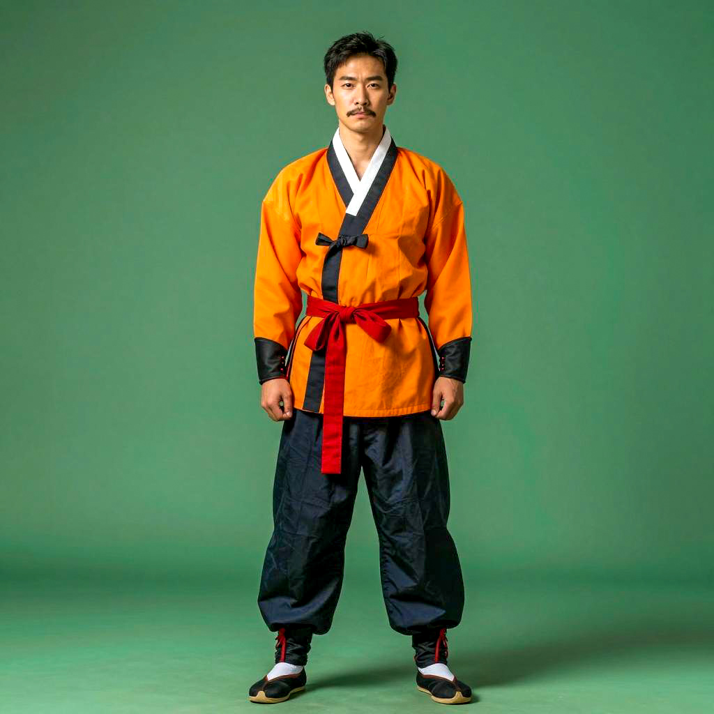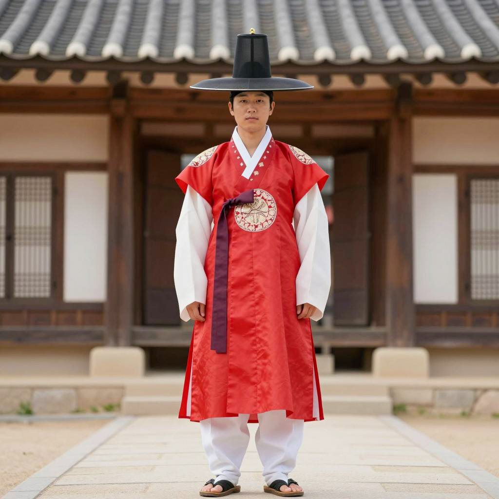 Custom clothing costume, photograph of a middle-aged Asian man, standing in front of a geometric stone wall, wearing traditional Korean hanbok, red and beige, long sleeves, loose pants, black sandals, topknot hairstyle, serious expression, daytime, natural light, full body shot, street setting